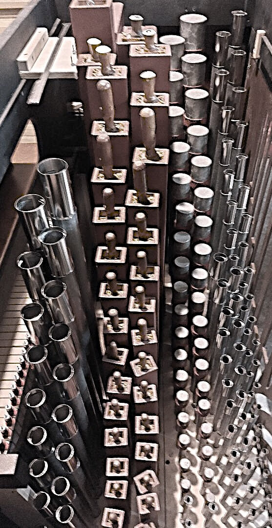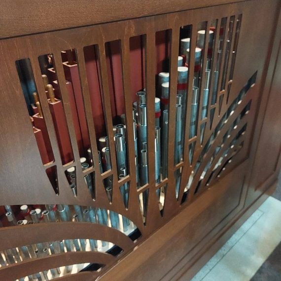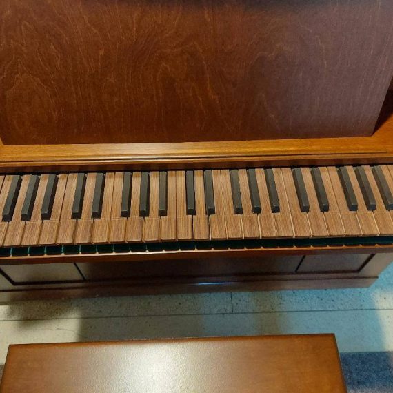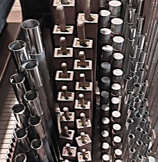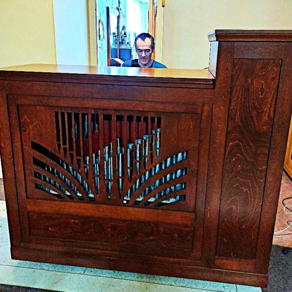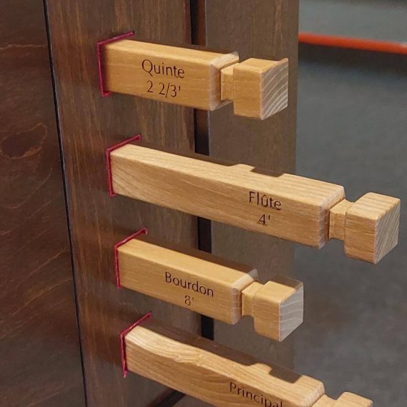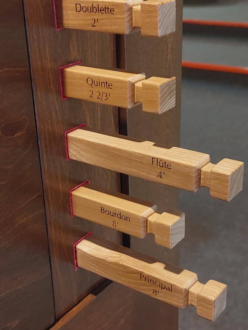 Traction mécanique, 5 jeux : Principal 8*, Bourdon 8, Flûte 4, Quinte 2 2/3*, Doublette 2 + Basse 8** ; Buffet en merisier ; clavier en ébène et bois de rose